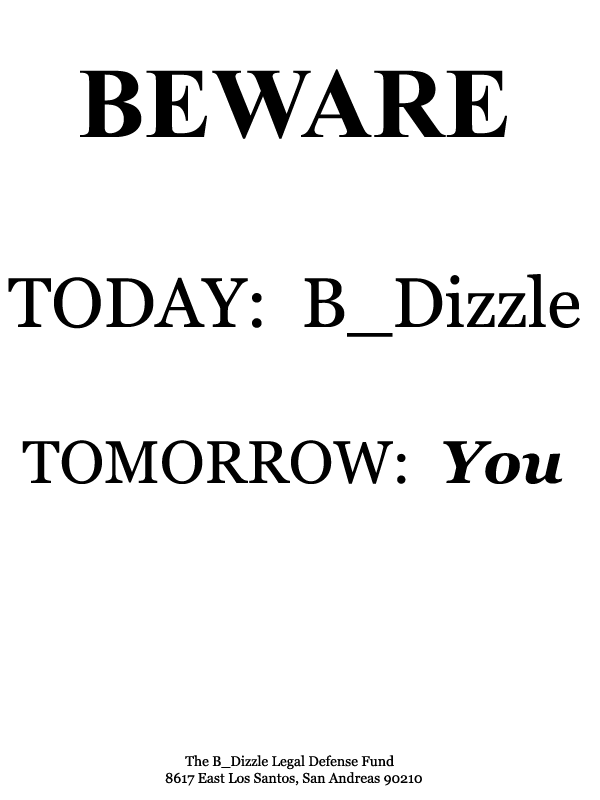 B_Dizzle was a recent acquaintance out of Los Santos. Raoul had worked with B_Dizzle in the past and saw no reason to dislike the young journalist. Connections were valuable and competent journalists were surprisingly difficult to come across. B_Dizzle worked for the largest broadcast and print news outlet in San Andreas, which was operating almost exclusively out of Los Santos. Recent legal trouble landed B_Dizzle in jail on serious charges ranging from drug trafficking to murder.